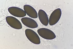 Asci 8-sporig, mit Apikalapparat. Sporen im Ascus biseriat angeordnet, gleichmäßig elliptisch, mit 2 Keimporen und jeweils einer zentral angehefteten Cauda.