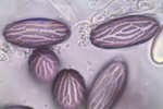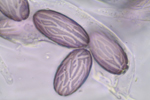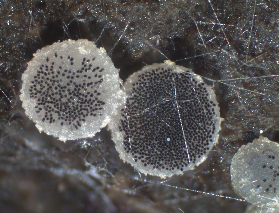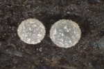 auf Rehdung. Apothezien weißlich, um 800 x 700 µm. Apothezienaußenseite mit weißlichen kleiigen Anhaftungen. Asci 8-sporig, J-, bis 350 x 37 µm. Sporen elliptisch, 17-18,5 x 8,5-9,5 µm.